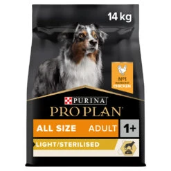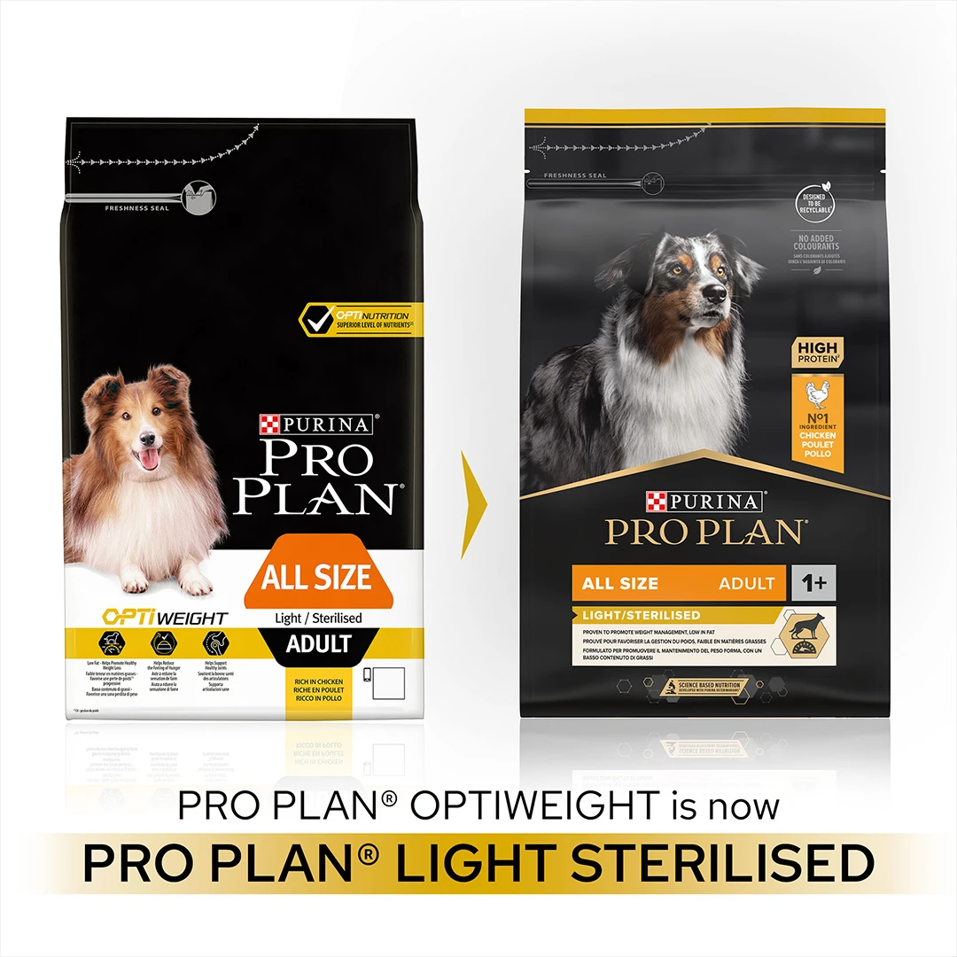 Purina PRO PLAN Light / Sterilised dry dog food is made with high quality chicken pieces as the first ingredient and optimised protein and fat levels. A lower fat content helps promote weight loss. When combined with a daily walk, this food is proven to enable a body fat loss of up to 60% within 12 weeks and healthy subsequent weight maintenance thanks to the high protein and low fat content. The careful formulation, a high protein content, complex carbohydrate sources and adequate fibre content, helps reduce the feeling of hunger.