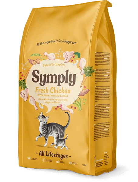 60.5% Chicken (Fresh Chicken 26%, Dried Chicken 26%, Chicken Fat 6.5%, Chicken Gravy 2%), Sweet Potato (13%), Potato (13%), Whole Oats, Whole Egg, Monosodium Phosphate, Whole Linseed, Salmon Oil (0.8%), Cranberry, Seaweed, Glucosamine (340 mg/kg), MSM (340 mg/kg), Chondroitin (240 mg/kg), Yucca Extract.